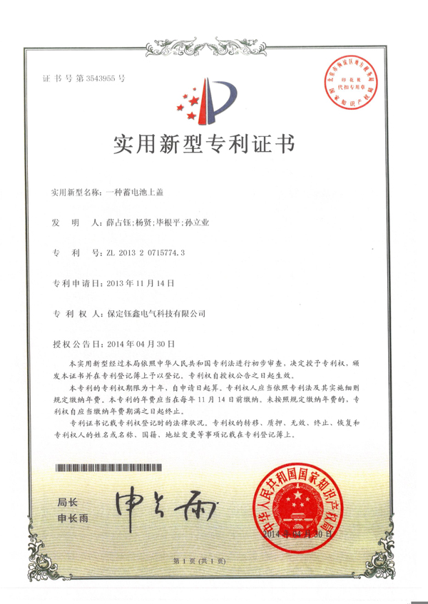 實(shí)用新型名稱:一種蓄電池上蓋,專利號:ZL 2013 2 0715774.3,專利申請日:2013年11月14日,專利權(quán)人:保定鈺鑫電氣科技有限公司,授權(quán)公告日:2014年04月30日