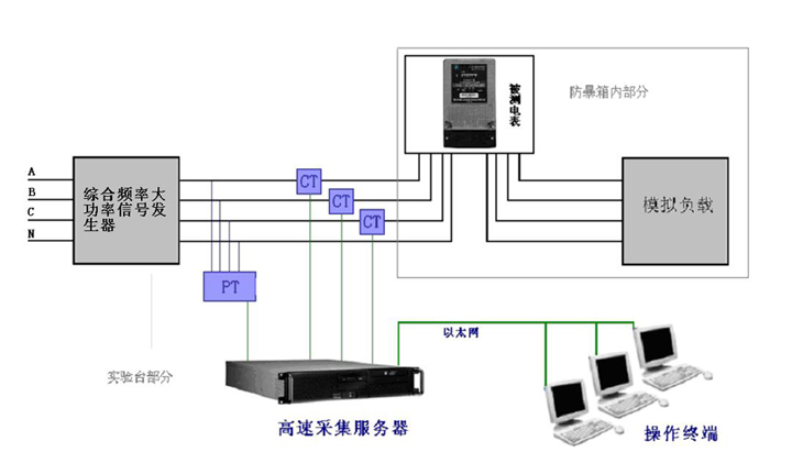 本平臺大概包括三部分:1、現(xiàn)場環(huán)境模擬試驗臺。2、精準(zhǔn)測量部分(應(yīng)用于電能表實驗室的高速采集服務(wù)器)。3、溫度可調(diào)的防暴試驗箱。